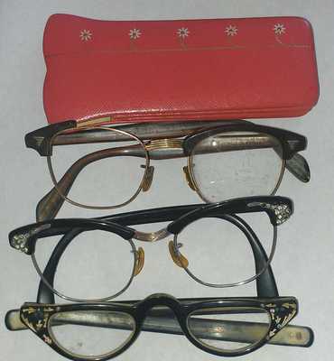 THREE ANTIQUE GOLDFILL & PLASTIC VINTAGE EYEGLASSES AND CASE