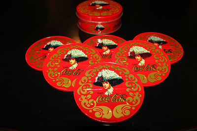 Title (ebay affiliate link): Beautiful Set of Coca Cola Coasters with Tin