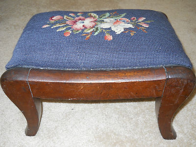 Title (ebay affiliate link): Vintage Petite Needlepoint Foot Stool~Floral on Navy Blue~Dk.Wood w/Curved Legs