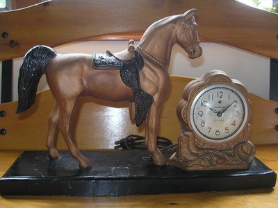 Title (ebay affiliate link): 1932 Bronze Horse Sculpture & Cowboy Clock Yorkshire electric
