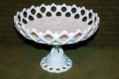 Title (ebay affiliate link): WESTMORELAND LACE WHITE MILK GLASS PEDESTAL FRUIT BOWL DISH COMPOTE CENTERPIECE