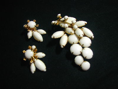 Title (ebay affiliate link): Vintage Beau Jewels Pin & Earrings Set White Milk Glass Round Cabs & Navettes