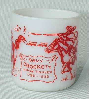 Title (ebay affiliate link): VINTAGE HAZEL ATLAS MILK GLASS MUG DAVY CROCKETT RED KIDDIE WARE CUP NICE 1940's