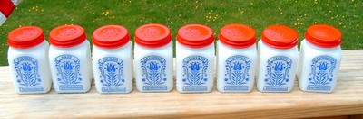 Title (ebay affiliate link): Set 8 Hazel Atlas Shakers Red Cap Early Mid Century Spice MILKGLASS Dutch