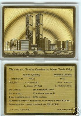 Title (ebay affiliate link): WTC, 9/11, 18KT GOLD CARD-WORLD TRADE CENTER- RARE