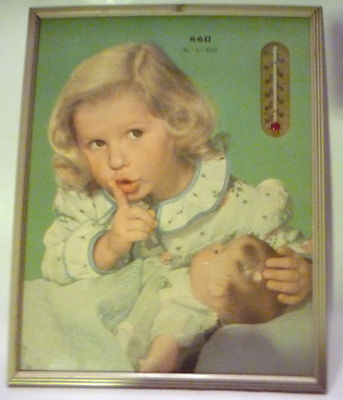 Title (ebay affiliate link): 1950's VINTAGE FRAMED PICTURE OF A LITTLE GIRL & DOLL WITH BUILT-IN THERMOMETER