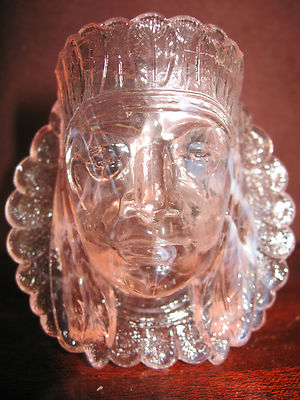 Pink milk slag glass tabletop toothpick holder Indian head chief match cranberry