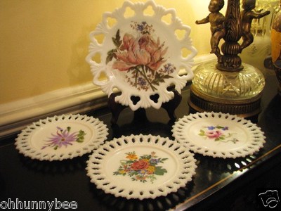 Title (ebay affiliate link): Vintage Fancy KEMPLE Milk Glass Hand Painted Floral Beaded Lace Edge Plates