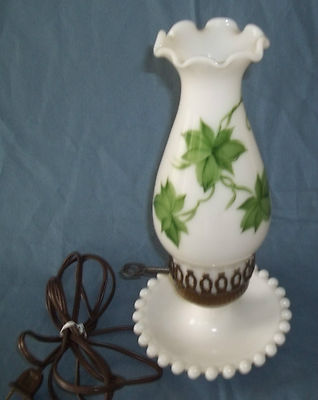Title (ebay affiliate link): Vtg Hand Painted Green Ivy White Beaded Milk Glass Boudoir Bedroom Table Lamp
