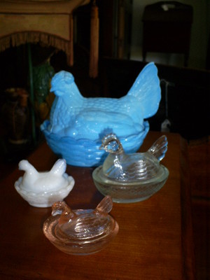 Title (ebay affiliate link): Hen On Nest Boyd Westmoreland Blue Opalescent Milk Glass Pink Depression Salts