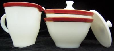 Title (ebay affiliate link): Vtg PYREX Creamer 2 Sugar Bowls 2 Lids RED GOLD Bands MILK GLASS Mid-Century