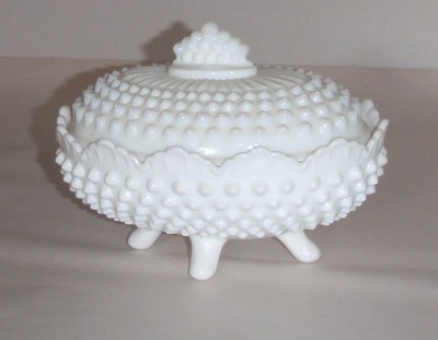 Title (ebay affiliate link): VINTAGE FENTON HOBNAIL MILK GLASS FOOTED DISH WITH LID SCALLOPED EDGES