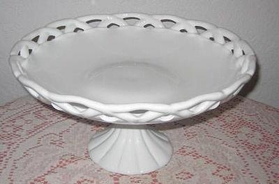 Title (ebay affiliate link): Beautiful White Milk Glass Compote/Cake Stand Open Lattice Design West Moreland