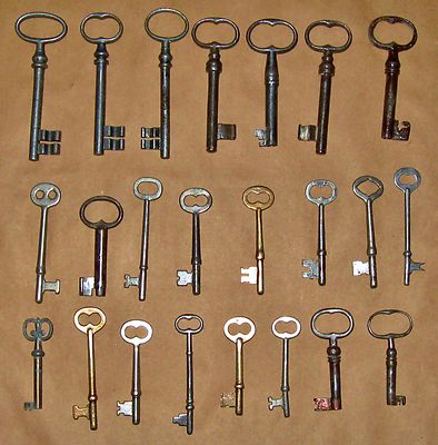 Title (ebay affiliate link): 23 OLD, ANTIQUE, VINTAGE METAL SKELETON KEYS CABINET & FURNITURE LOCK KEYS