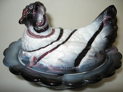 Amethyst and milk slag glass salt cellar hen chicken on nest basket dish purple