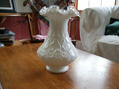 Fenton milk glass spanish lace silver crest vase approx. 8"