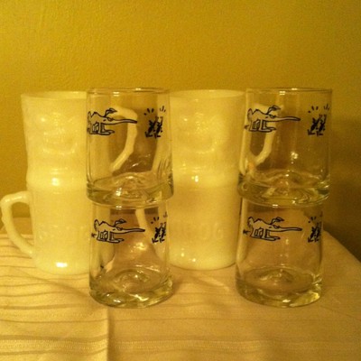 Title (ebay affiliate link): Johnny Hart BC Comic Anchor Hocking Fire King 4 milk glass Grog Mugs & 4 Glasses