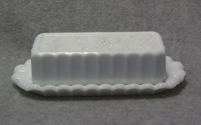 Title (ebay affiliate link): Westmoreland White Milk Glass Butter Dish & Lid Cover Grape Paneled Design