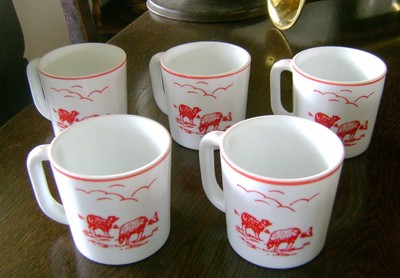 Title (ebay affiliate link): Set of 5 Vitrock Red & White Milk glass CupsLittle Bo Peep- Ankor Hocking!!