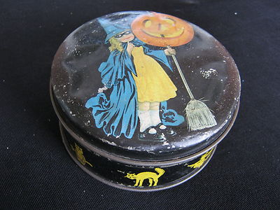 Title (ebay affiliate link): VINTAGE TINDECO TIN HALLOWEEN WITCH WITH BROOM & JACK O LANTERN