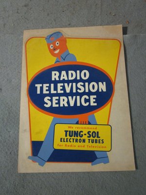 Title (ebay affiliate link): VINTAGE 1950's TUNG-SOL TUBES RADIO TELEVISION SERVICE DECAL TRANSFER SIGN