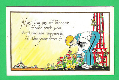 Easter vintage postcard/young boy looking at chicks/embossed/Art Deco