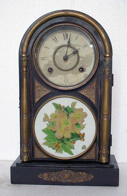 Title (ebay affiliate link): ANTIQUE HORSE MARK COLOR FLORAL GLASS PANEL COLUMN BRASS TRIM MANTLE CLOCK