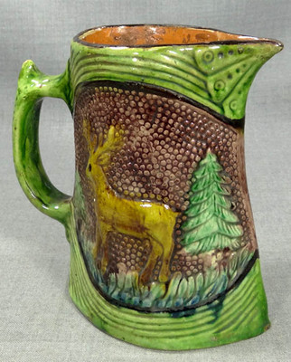 Title (ebay affiliate link): 19c. GLAZED REDWARE POTTERY SYRUP PITCHER BUTTERFLY TANKARD EWER JUG w/DEER STAG
