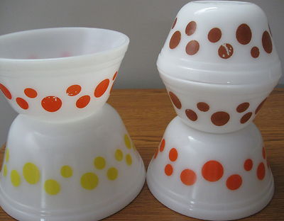Title (ebay affiliate link): 5 Federal Glass Polka Dot Milk Glass Oven Ware Mixing Bowls Brown Orange Yellow