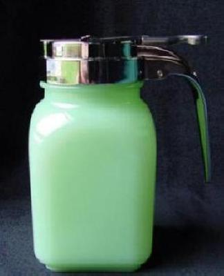 Title (ebay affiliate link): JADITE JADE JADEITE GREEN MILK Glass HOT MAPLE SYRUP PITCHER DISPENSER BLUEBERRY