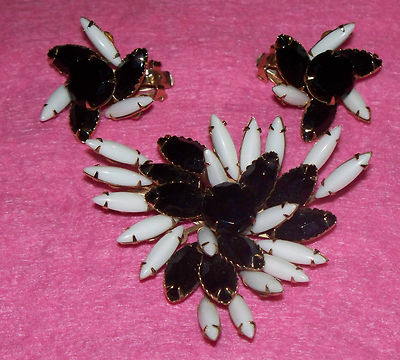 Title (ebay affiliate link): Vintage Milk Glass & Jet Navette Rhinestone Prong Set Brooch/Pin & Earrings