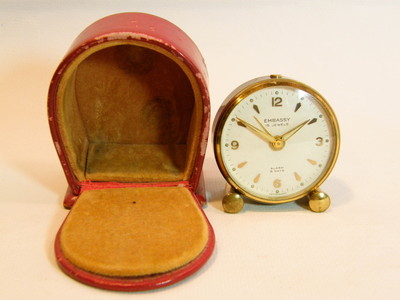 Title (ebay affiliate link): VINTAGE BRONZE EMBASSY 15 JEWEL 8 DAY TRAVEL ALARM CLOCK