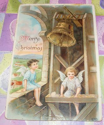 Title (ebay affiliate link): Young Winged Angels^Gold Bell Tower^Vintage German Christmas Art Postcard 1900s