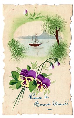 Title (ebay affiliate link): VINTAGE 1900s FRENCH POSTCARD HAND PAINTED FLOWER PANSY BOAT