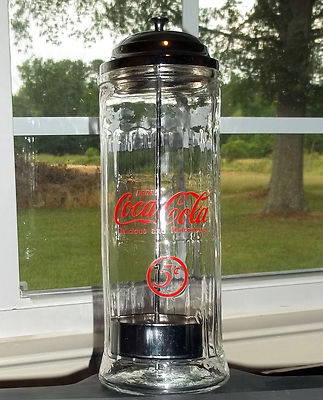 Title (ebay affiliate link): VINTAGE Large COCA-COLA COKE Heavy Glass & Chrome 5 Cent STRAW DISPENSER Holder