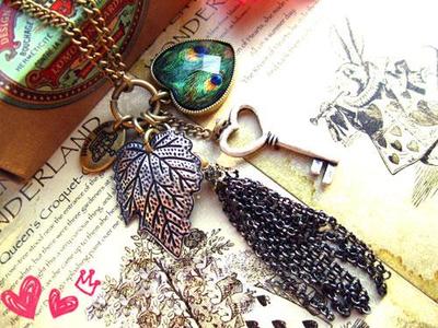Title (ebay affiliate link): Vintag necklace Peacock feather Big leaf peach heart key tassel pendants chain
