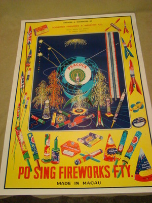 VINTAGE PO SING PEACOCK FIREWORKS POSTER FIRECRACKER SIGN MADE MACAU EXCELLENT