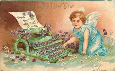 Title (ebay affiliate link): New Year Cupid~Blue Gown~Violet Flower Lime Green Typewriter~Emboss~Intl Art Pub