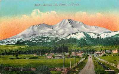 Title (ebay affiliate link): Mount Shasta California~Sunrise over Snowy Caps~Village Below~Dirt Road~1908 PC