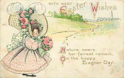 Title (ebay affiliate link): Bertha E Blodget~Huge Easter Bonnet Girl~Pink Mint~Flowers~Feather~Embossed~AMP