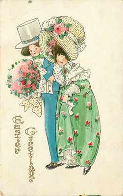 Title (ebay affiliate link): Bertha E Blodget~Big Easter Bonnet Girl~Fella in Top Hat~Roses~Embossed~1911~AMP