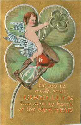 Title (ebay affiliate link): New Year Fantasy~Winged Hourglass~Cupid Rides~Giant Shamrock~Silver~Gold Emboss