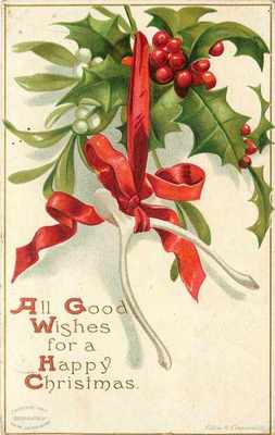 Title (ebay affiliate link): Christmas~Wishbone Hanging By Red Ribbon~Mistletoe~Holly Berry~Ellen Clapsaddle