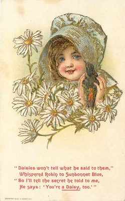 Title (ebay affiliate link): Maud Humphrey~Robin Whispers to Sunbonnet Blue Girl~Daisies~Gold Leaf~Gray Litho