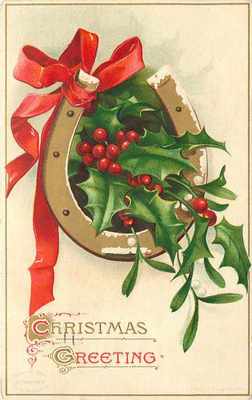 Christmas~Red Ribbon~Gold Horseshoe Spills Mistletoe~Holly~Ellen H Clapsaddle