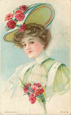 Title (ebay affiliate link): Maud Humphrey~Lovely Lady~Lime Green Hat~Lacy Collar~Pink Red Carnations~PC 10