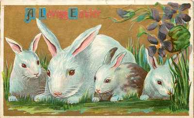 Title (ebay affiliate link): Easter~White Mama Bunny Rabbit~3 Babies~Portrait~In Violets~Grass~Gold Embossed