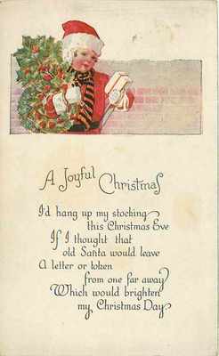 Title (ebay affiliate link): Christmas~Boy in Red Coat & Hat~Striped Scarf~Wreaths Under Arm~Packages~1919