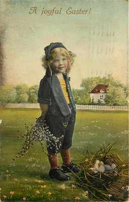 Title (ebay affiliate link): Easter~Curly Haired Blonde Girl~Colored Egg Nest Basket~Pussy Willow~Meadow~1911