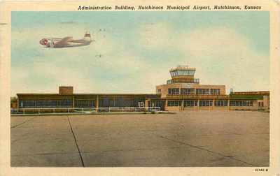 Title (ebay affiliate link): Hutchinson Kansas~Municipal Airport~Control Tower~Plane in Flight~1952 Postcard